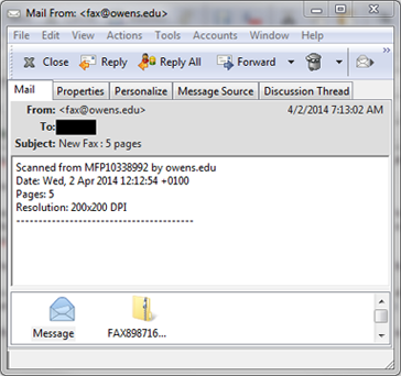 Example 1: Infection by "phishing" email from "fax@owens.edu" with virus in attachment.