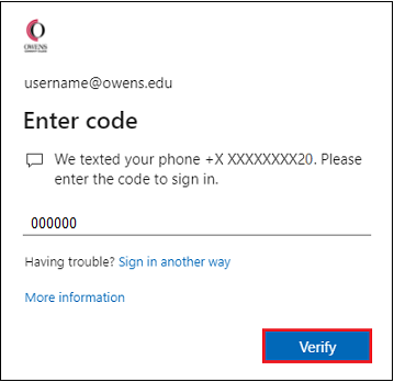 - You will receive a text message with a six-digit code. Enter the code and click Next.