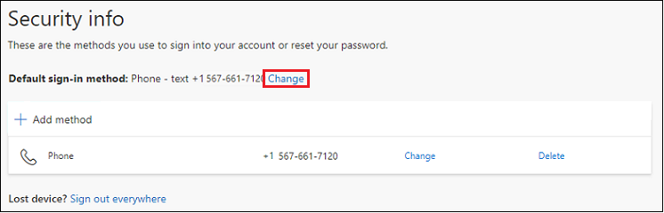 - Select Change at the end of the Default sign-in method: line.