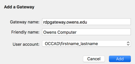 How do I connect to the Owens Remote Desktop Gateway from my Mac computer?
