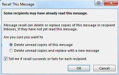 If you are sending the message to many recipients, you may want to clear the Tell me if recall succeeds or fails for each recipient check box. In the Recall This Message dialog shown above, there is another selection that lets you replace your deleted message with a new message. This selection is appropriate for situations where you may have forgotten to add an attachment. The original message is removed from the mailboxes of the recipients who have not yet opened it, and then is replaced with the updated message.
