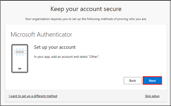 8. Click Next to set up verification using the Microsoft Authenticator App. The Microsoft Authenticator App is the recommended method to use.