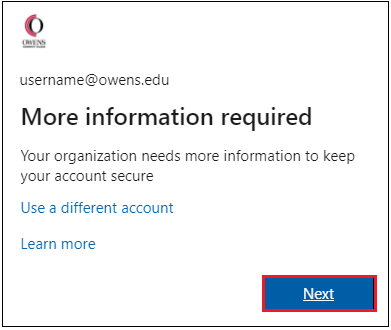 - Enter your username followed by @owens.edu. For example, username@owens.edu.