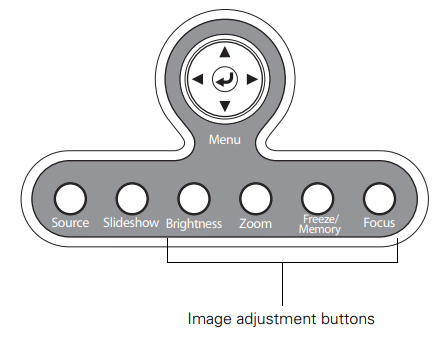 Adjusts the image brightness. Press button until desired brightness is reached. Does not adjust lamp brightness.